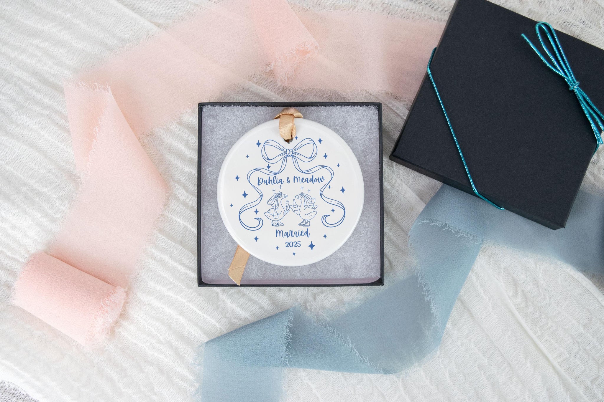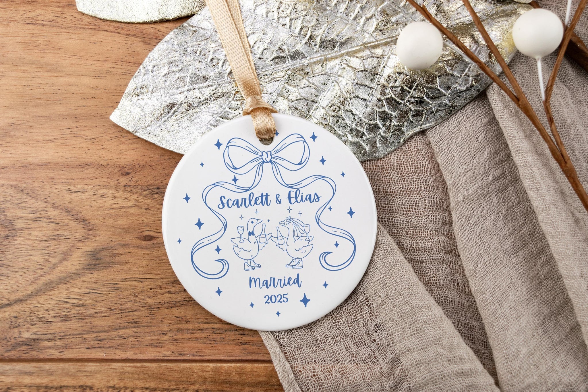 Each ornament is sublimation printed on smooth ceramic, creating a crisp, lasting design that won’t peel or fade. Personalized with your names and wedding year, it makes a sweet addition to your first Christmas tree as a married couple, or a thoughtful gift for newlyweds who appreciate a good laugh.
