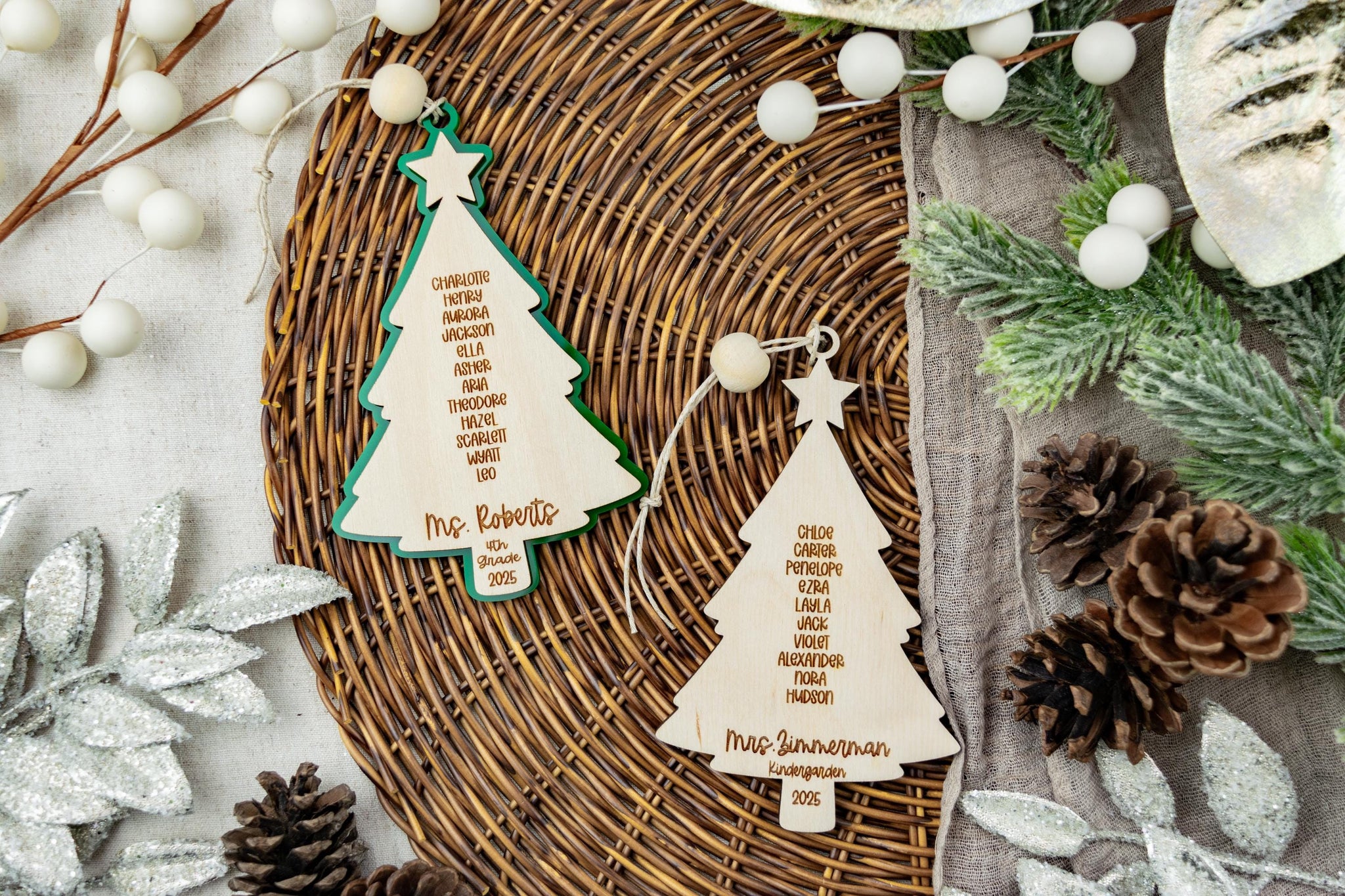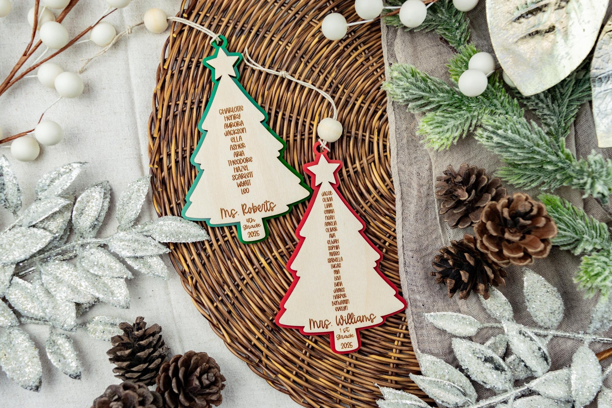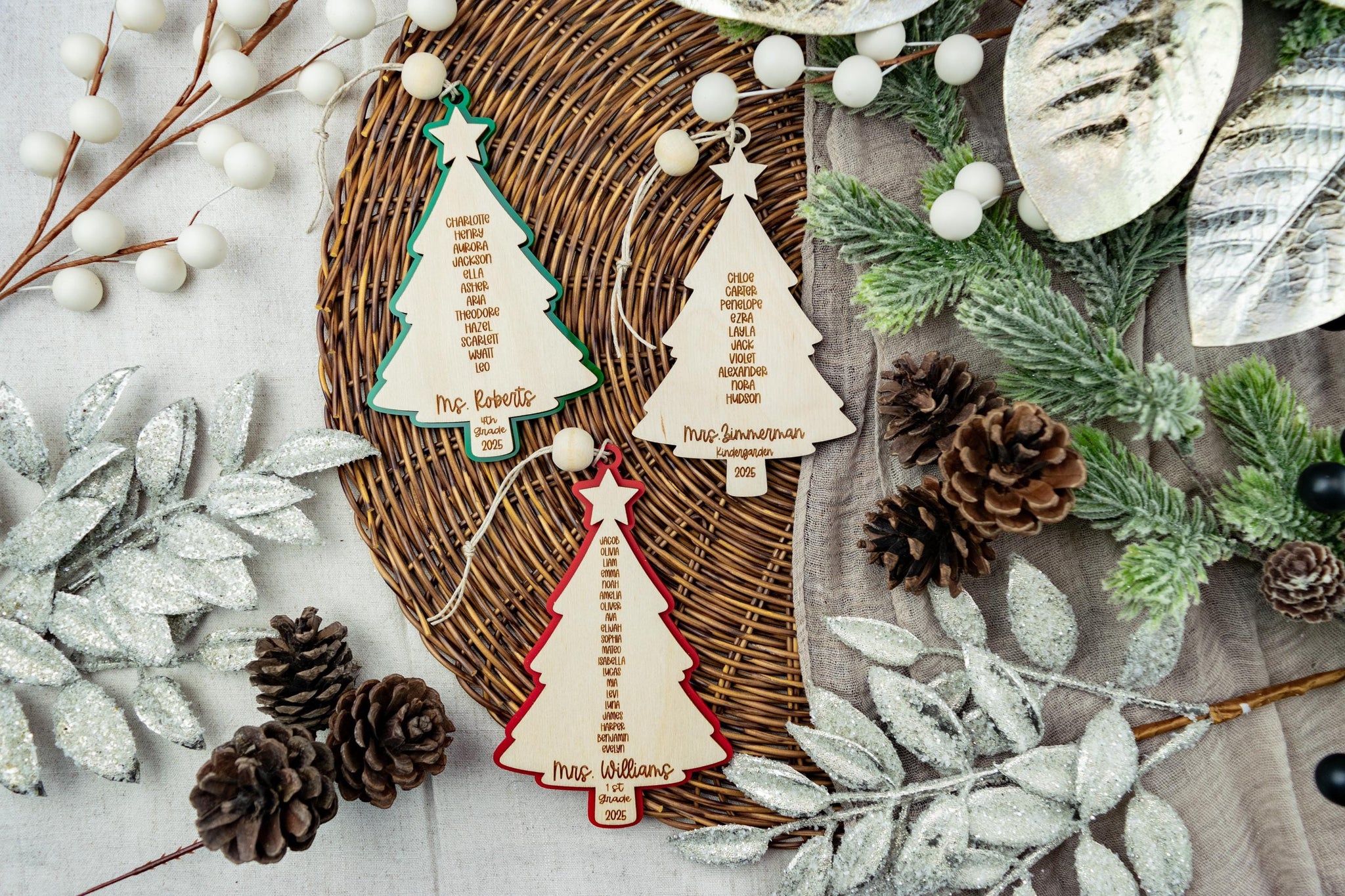 Personalized with the teacher’s name, grade, year, and up to 30 student names, each ornament is carefully crafted to create a lasting reminder of the class. It’s a thoughtful, sentimental gift for teachers to hang on their Christmas tree year after year.