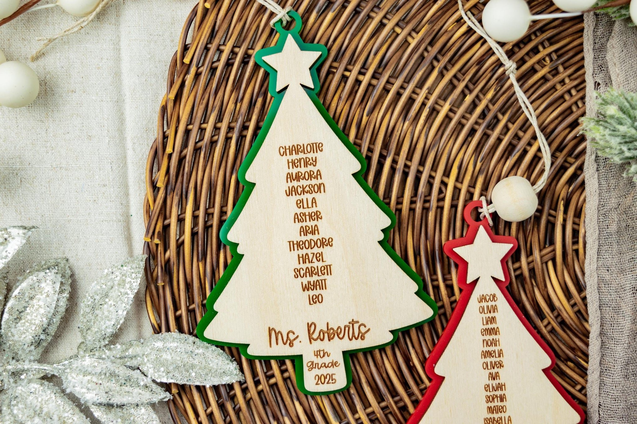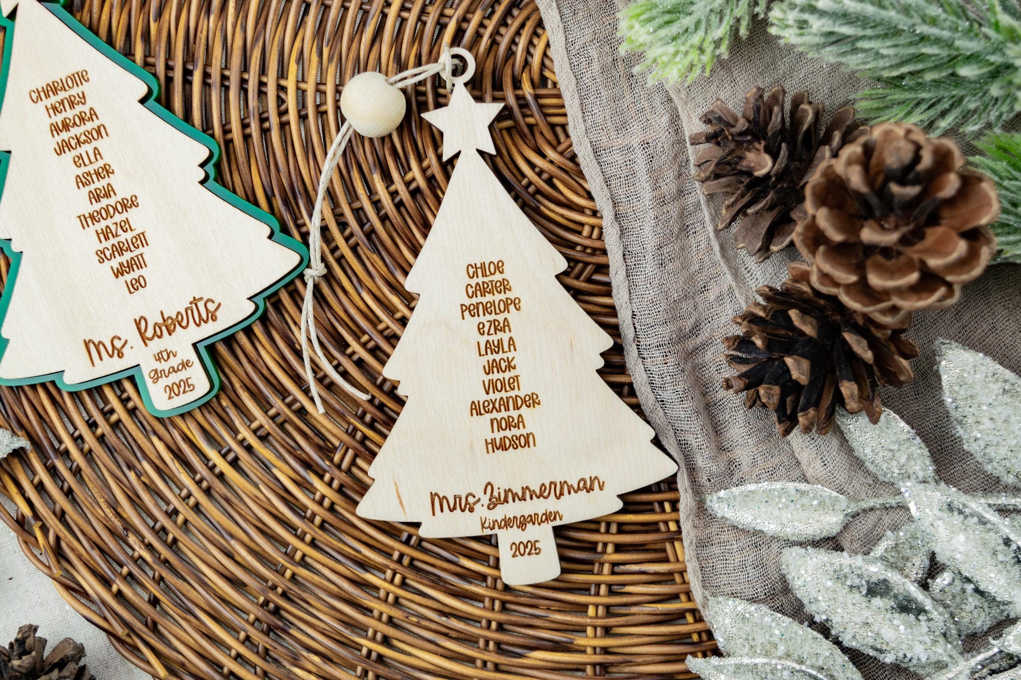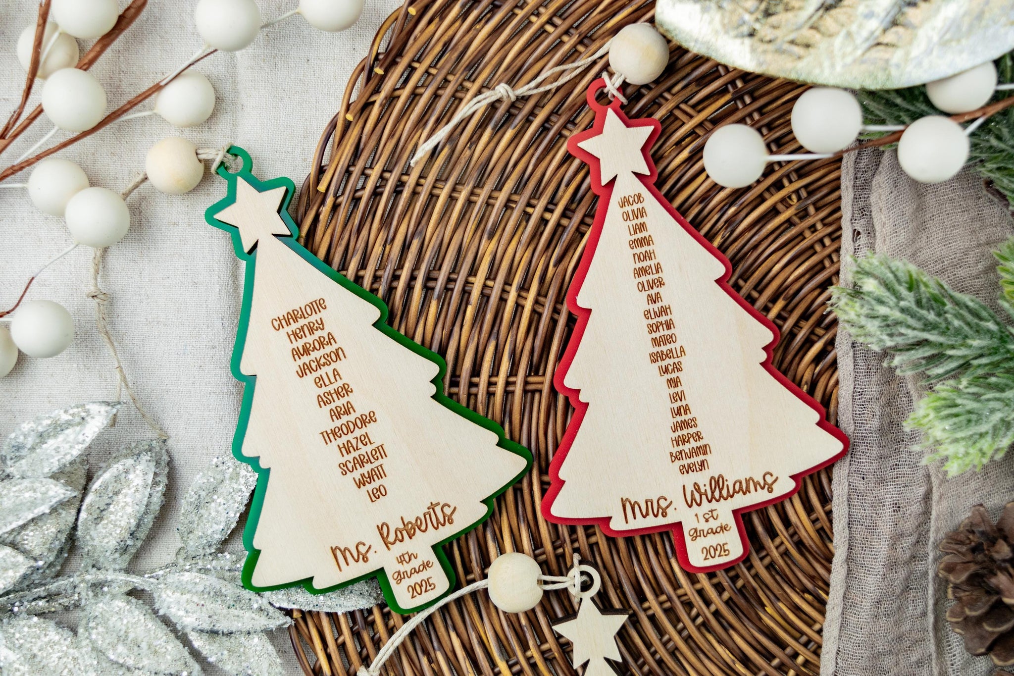 Personalized with the teacher’s name, grade, year, and up to 30 student names, each ornament is carefully crafted to create a lasting reminder of the class. It’s a thoughtful, sentimental gift for teachers to hang on their Christmas tree year after year.