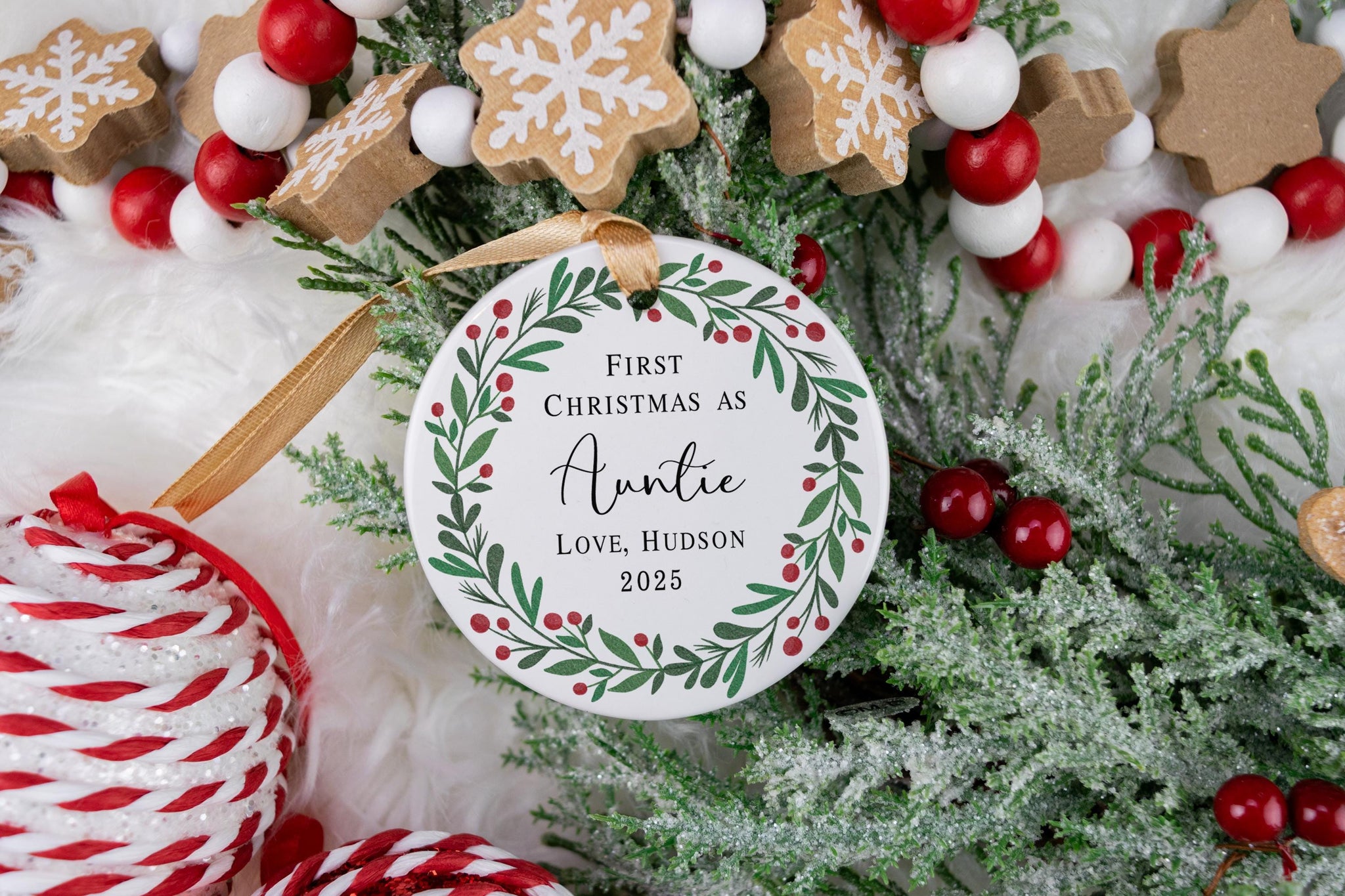 Each ornament is professionally sublimation printed on a smooth ceramic base, giving it a soft, lasting finish that beautifully showcases the festive wreath design and personalized message. Whether it’s a gift from a new niece or nephew or a pregnancy announcement for a sister or close friend, this ornament captures the joy of becoming “Auntie.”