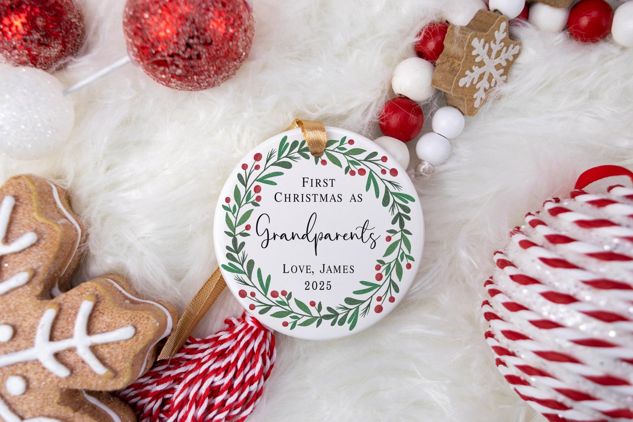 Each ornament is professionally sublimation printed on a smooth ceramic base, creating a soft, lasting finish that beautifully displays the personalized message and festive wreath design. It’s a heartfelt way to celebrate a pregnancy announcement or commemorate their first Christmas with a grandchild already here.
