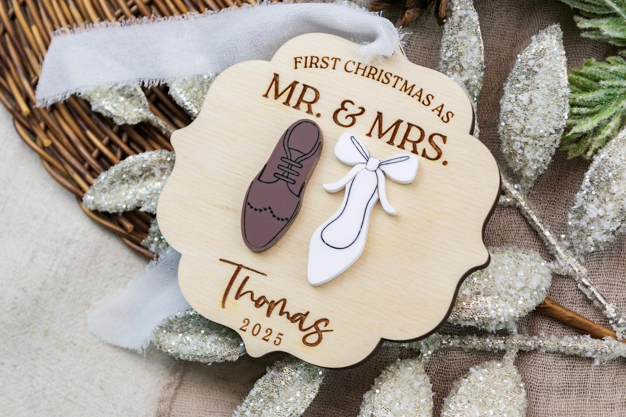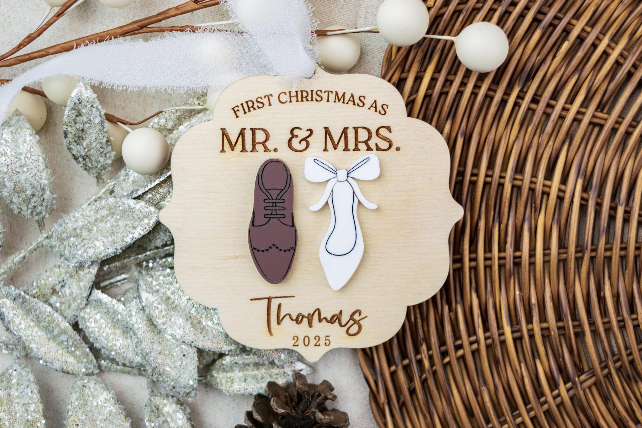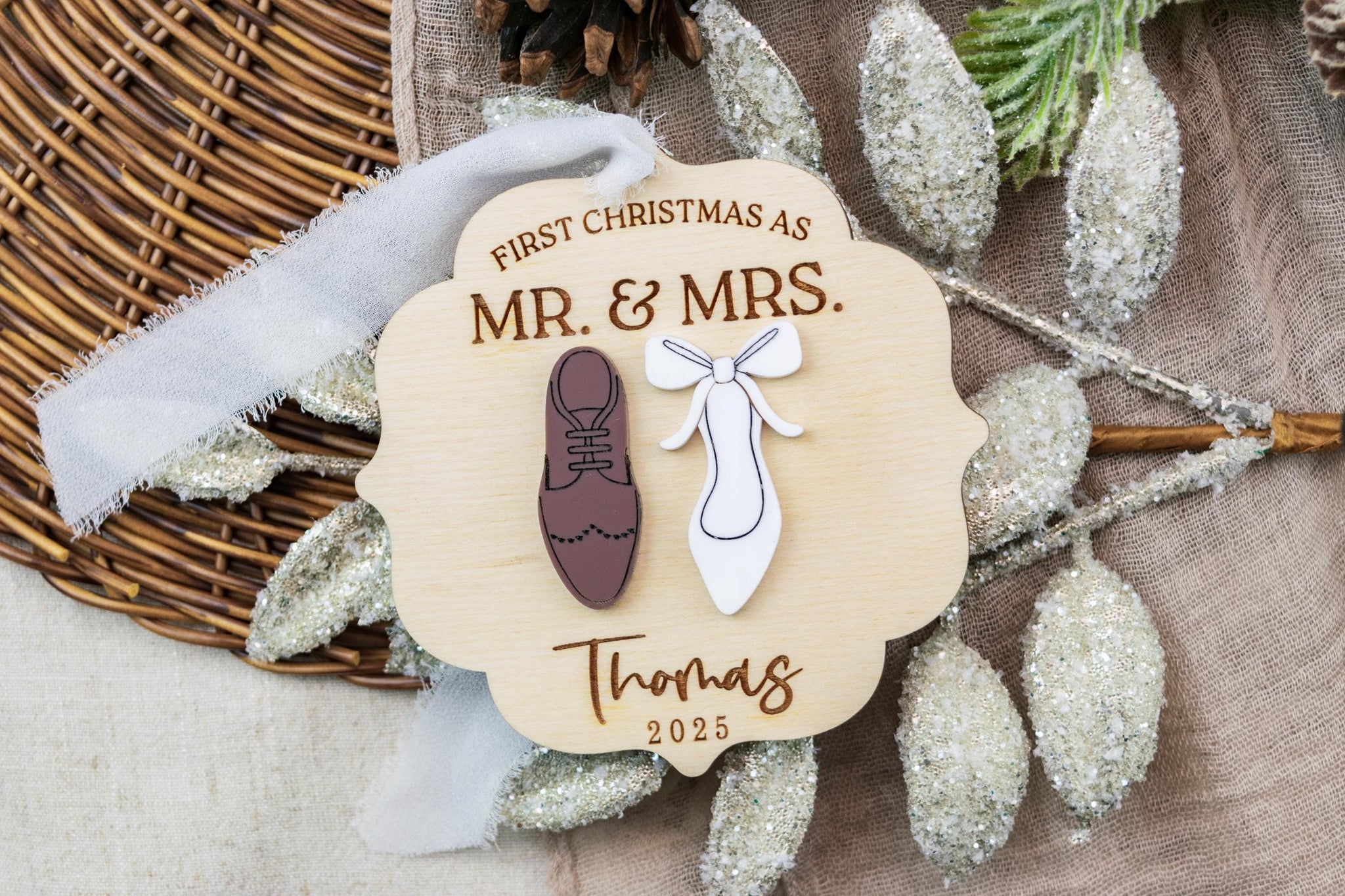 Each ornament is made from engraved birch wood and features a pair of acrylic shoes, one classic dress shoe and one elegant heel. Symbolizing your special union. Choose your preferred pair: Mr. & Mrs., Mr. & Mr., or Mrs. & Mrs. Personalize it with your last name and year to make it the perfect match for your love story.