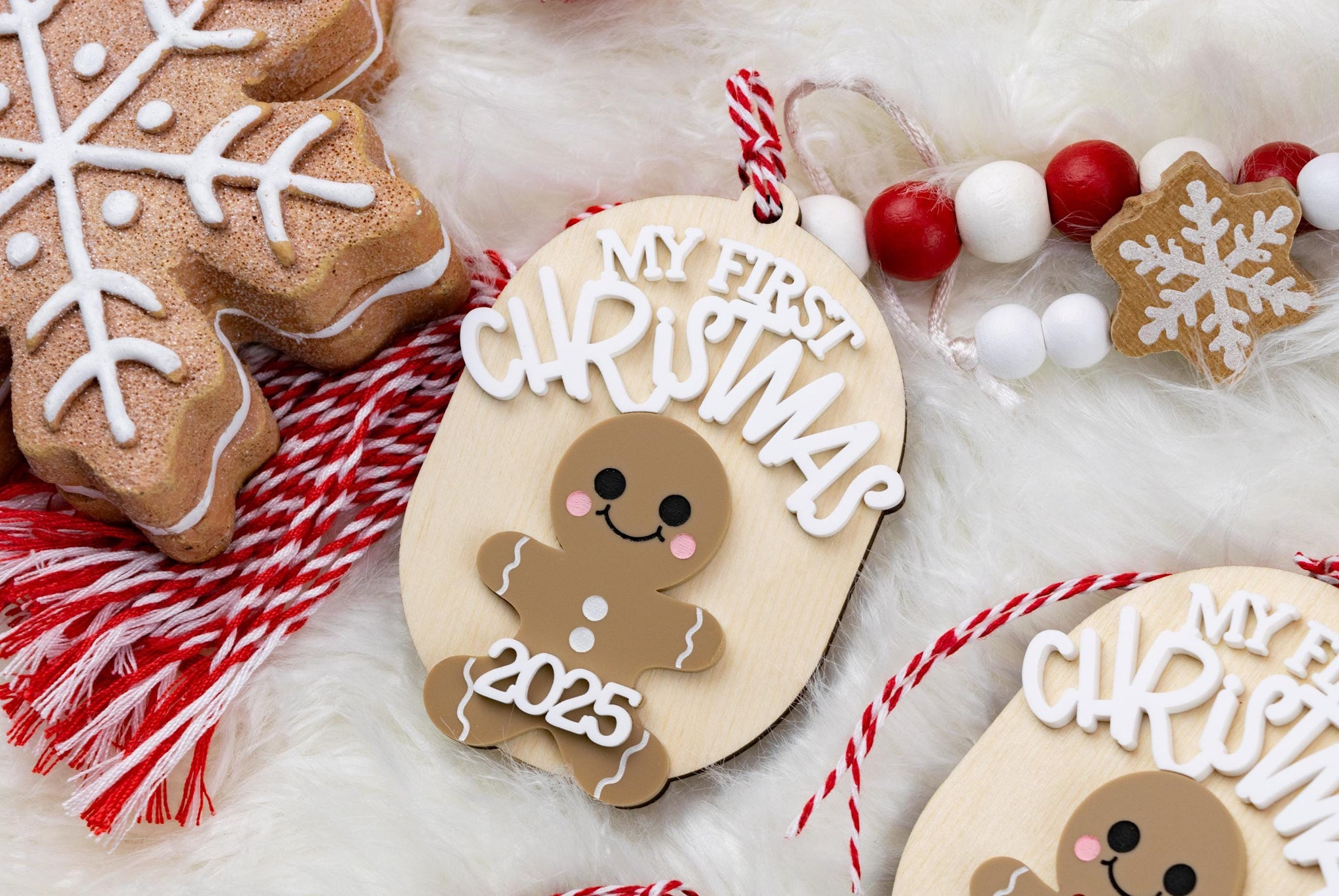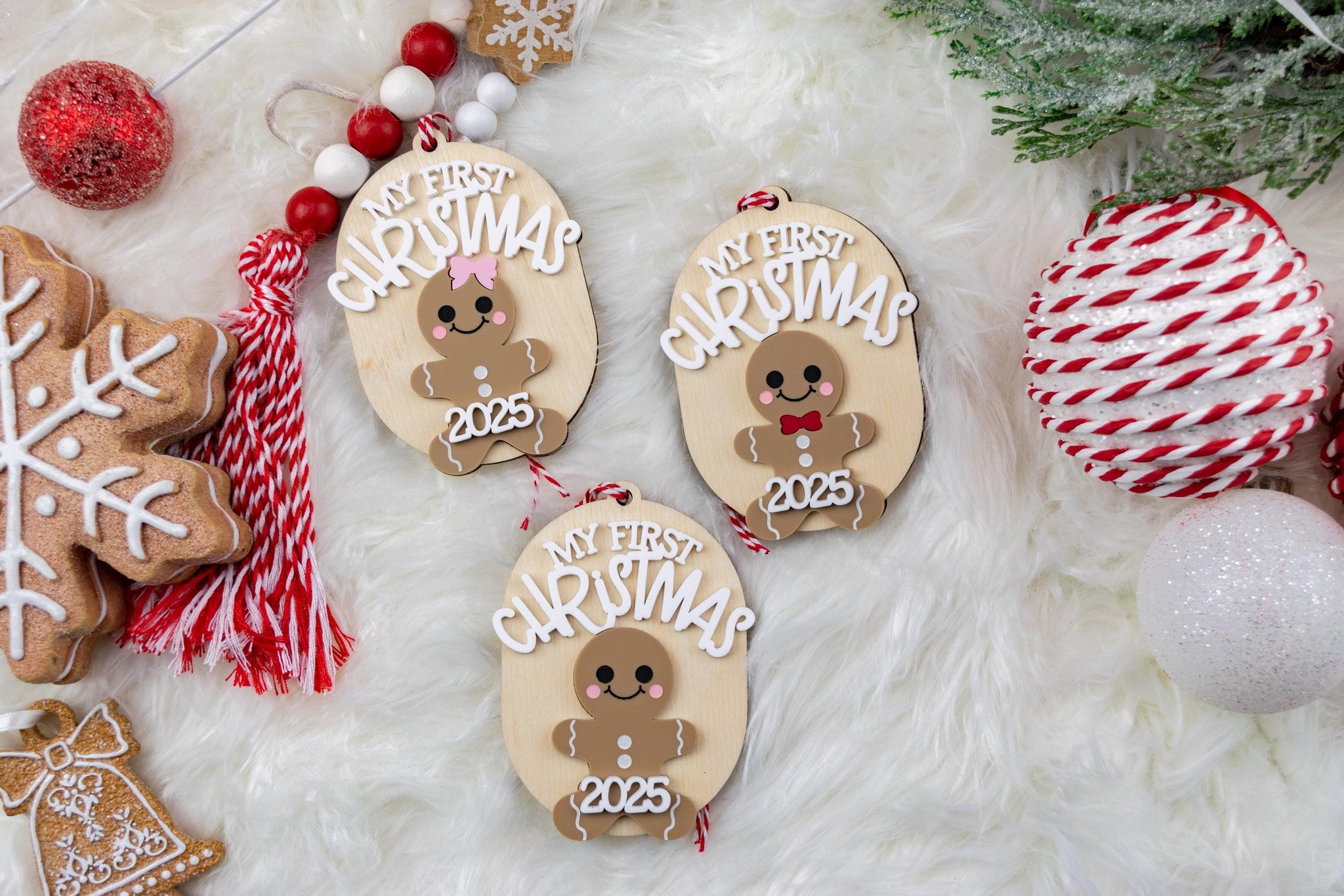 Celebrate baby’s first holiday season with this adorable gingerbread “My First Christmas” ornament, the perfect keepsake for your little one’s tree. Each ornament features a gingerbread figure with your choice of three styles: classic plain, bowtie, or bow on her head.