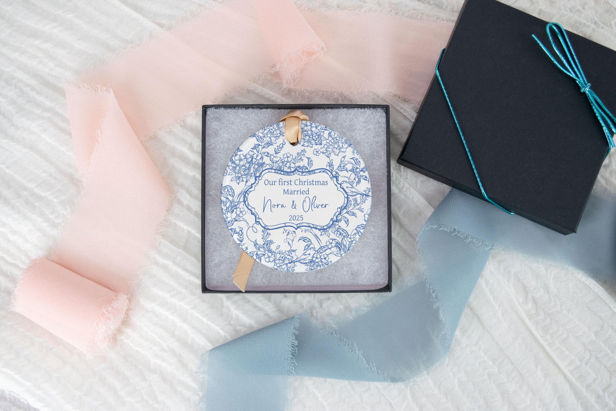 Celebrate your first holiday season as newlyweds with this elegant Blue Toile Married Ornament, designed to capture the beauty of your wedding year.