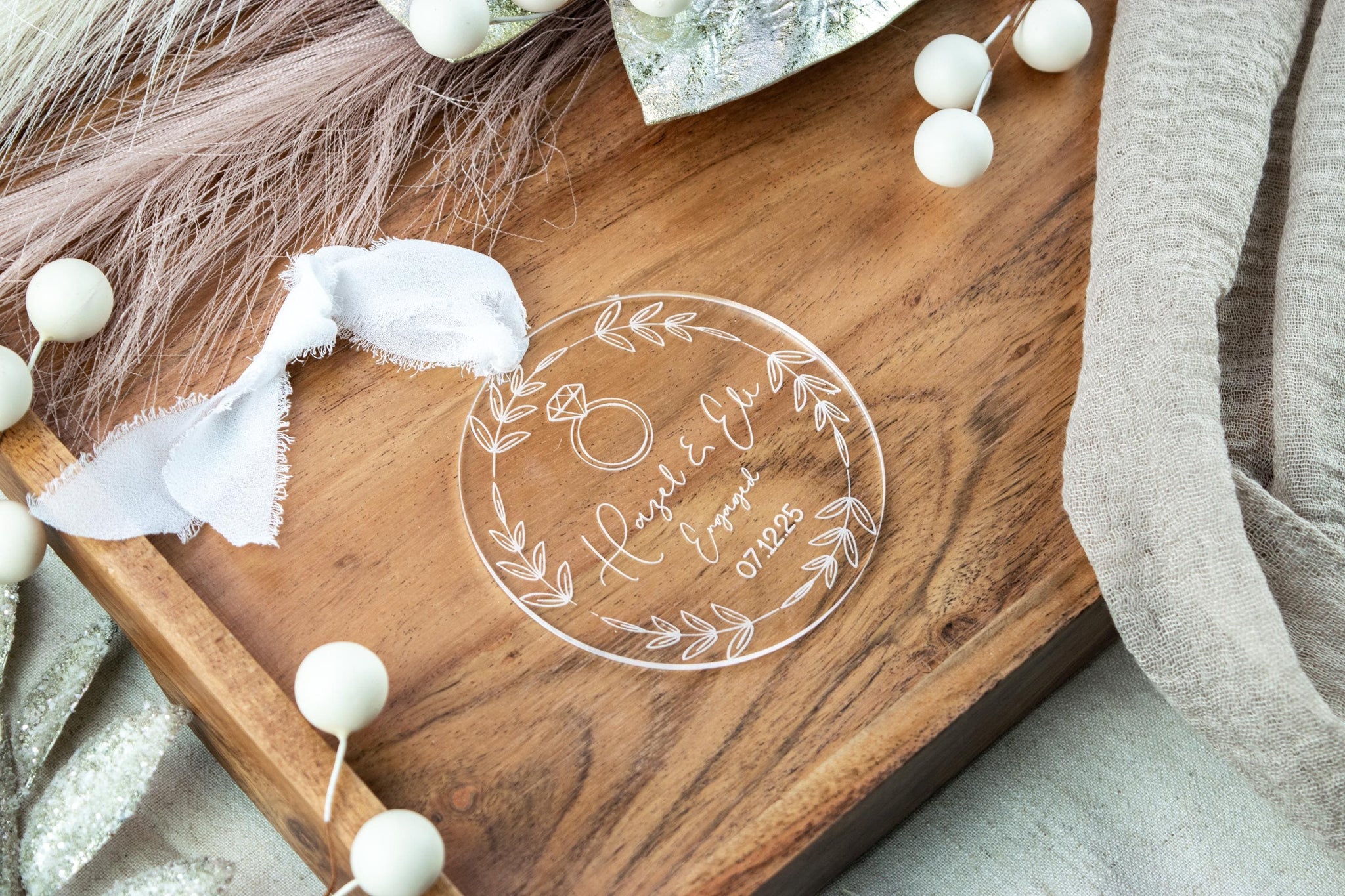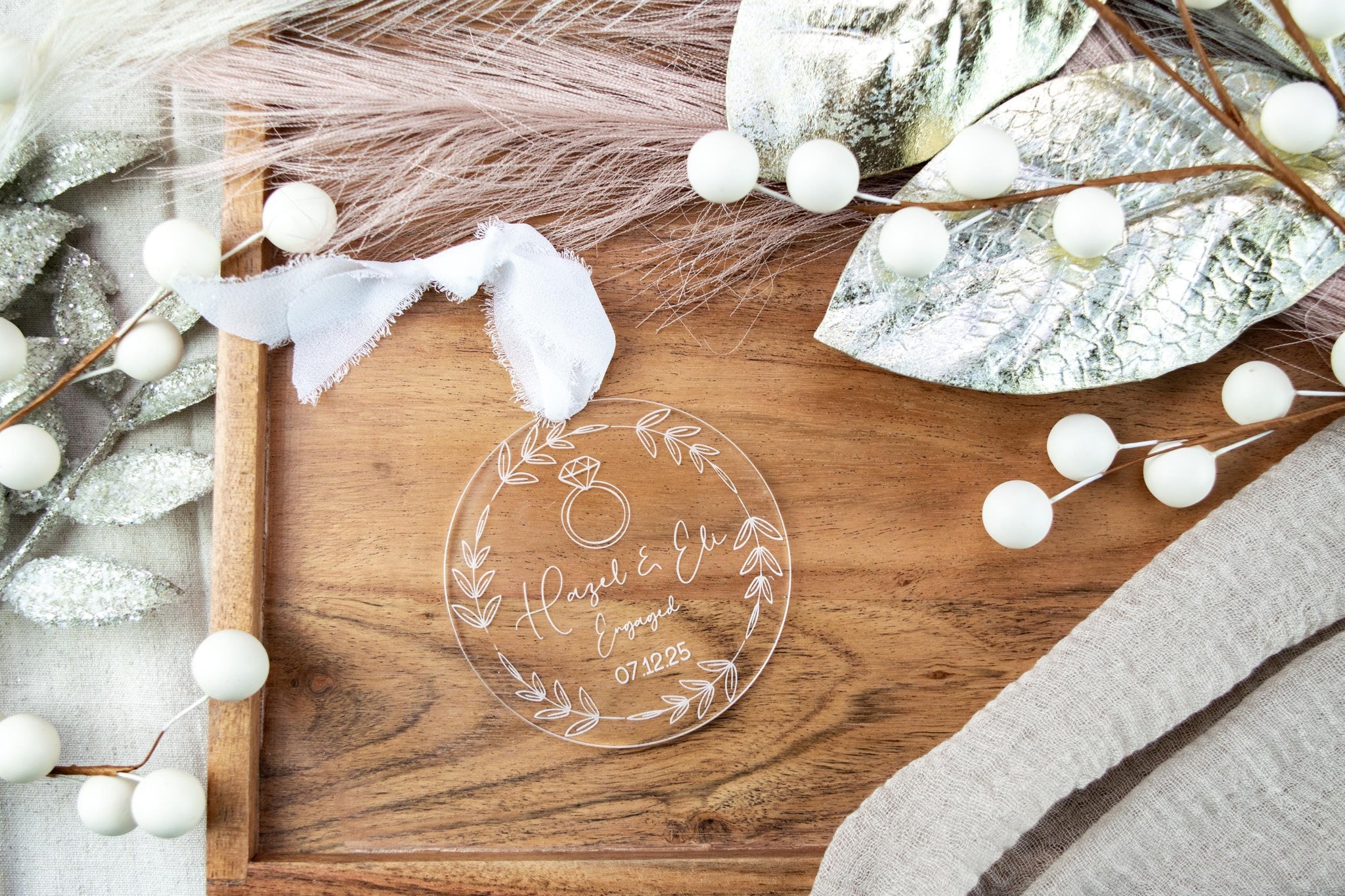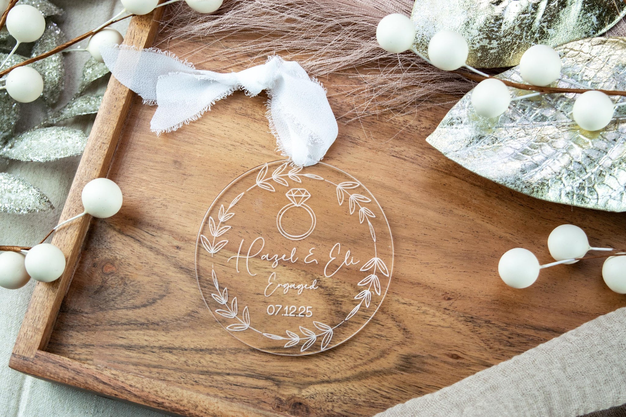 Each ornament is laser engraved on clear acrylic and features a delicate wreath design encircling a engagement ring illustration. Your names and engagement date are beautifully engraved in the center, making this piece a stunning way to commemorate your “Yes!” moment.