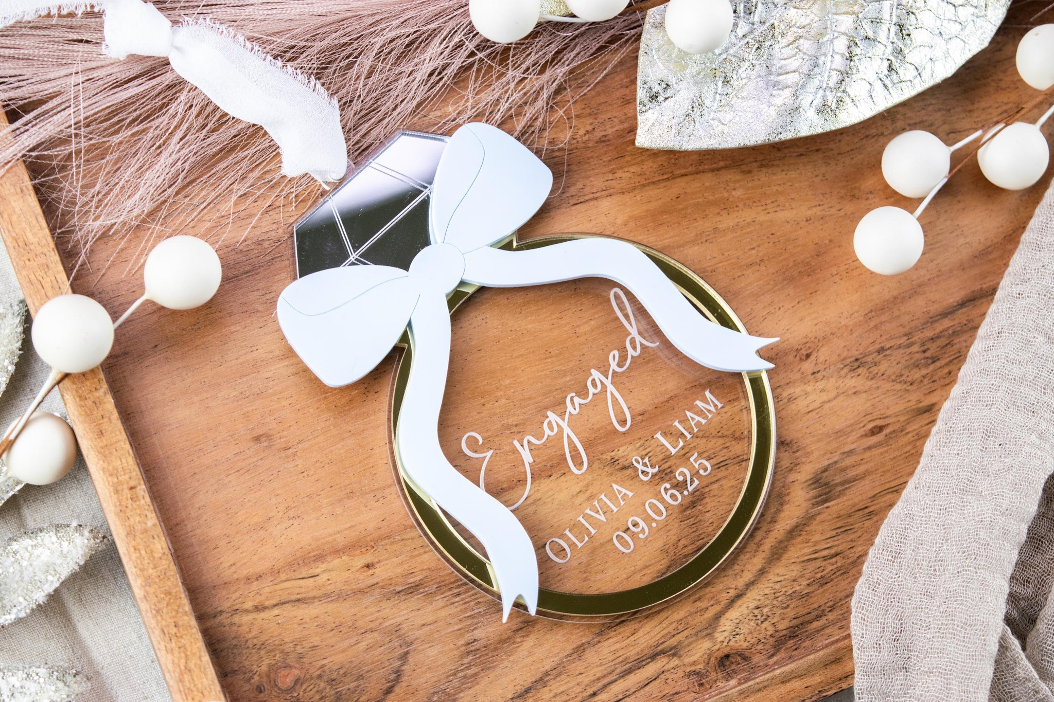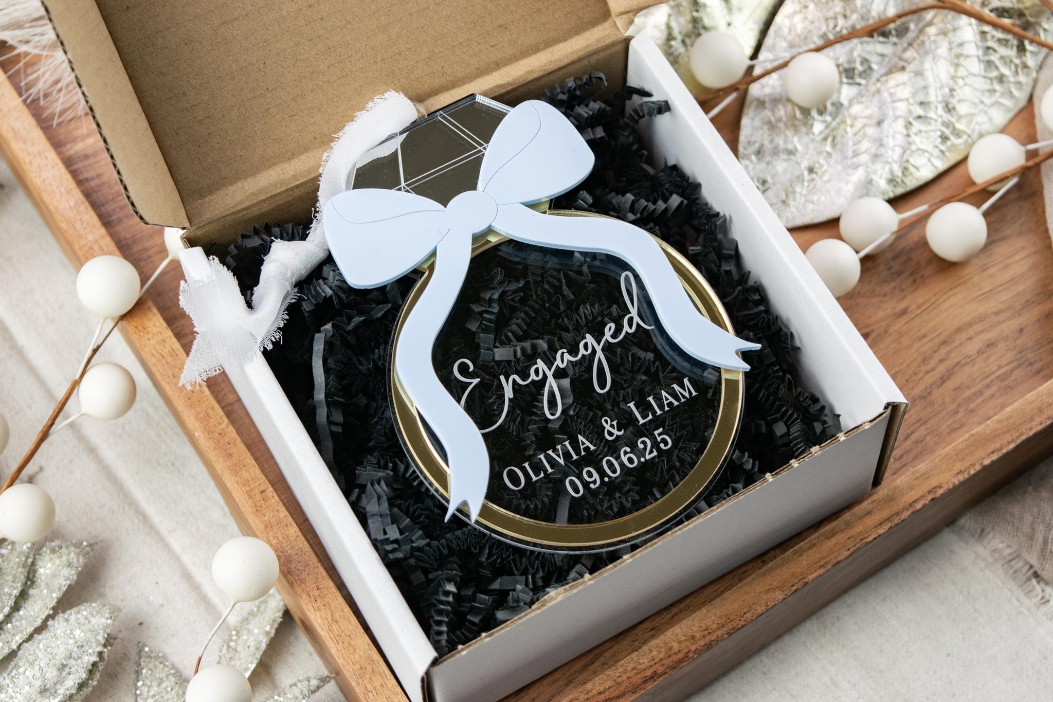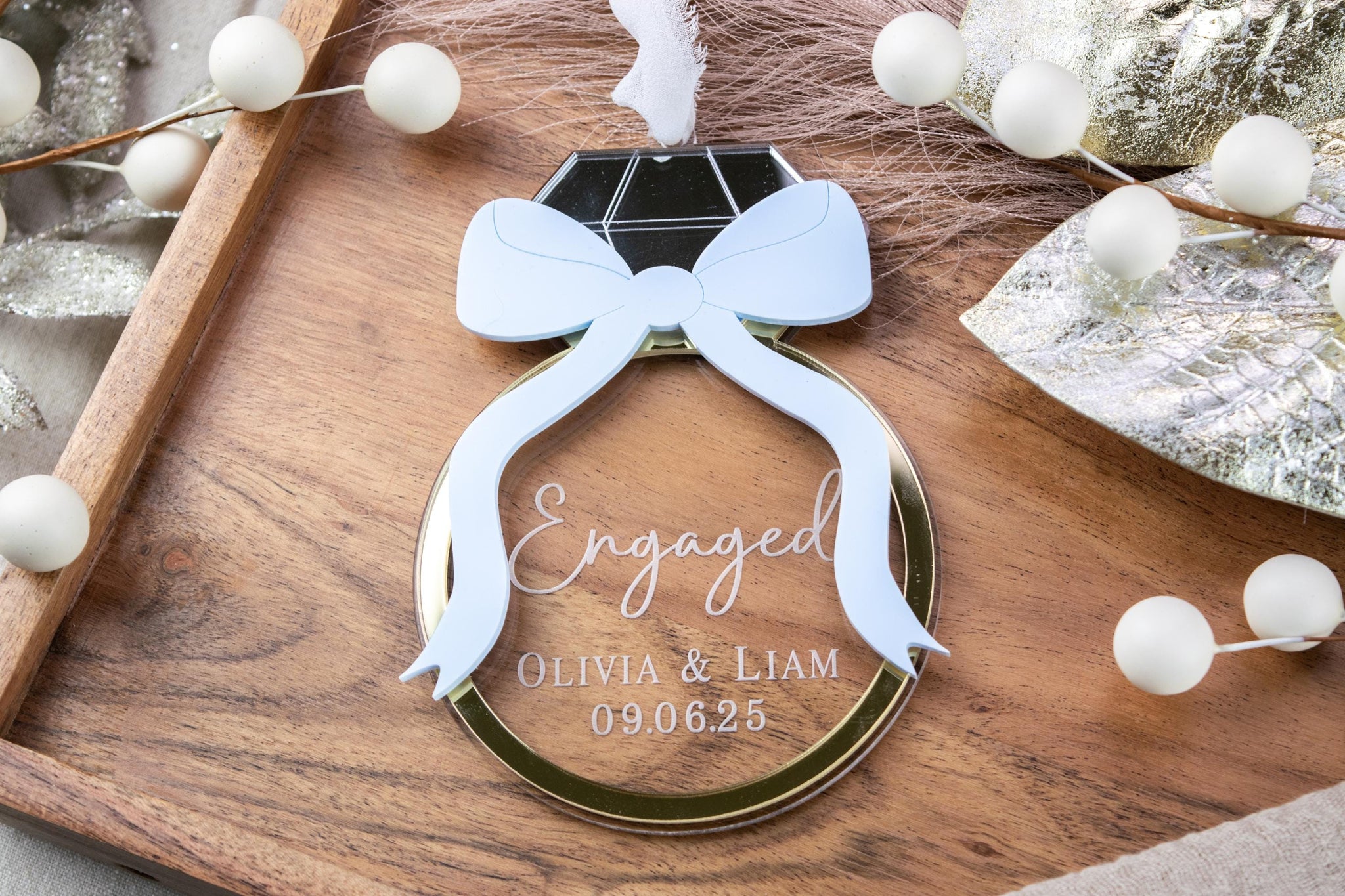 Crafted from mirrored acrylic, this ornament features a gold ring design topped with a silver “diamond” and an acrylic bow accent for a sweet, timeless touch. The clear center is engraved with “Engaged,” your names, and your special date. Creating a meaningful piece that sparkles beautifully under the lights.