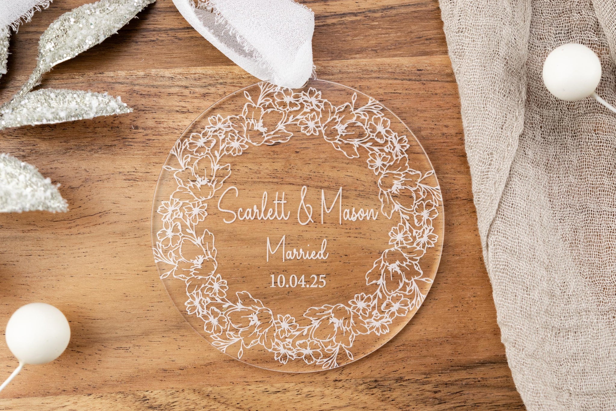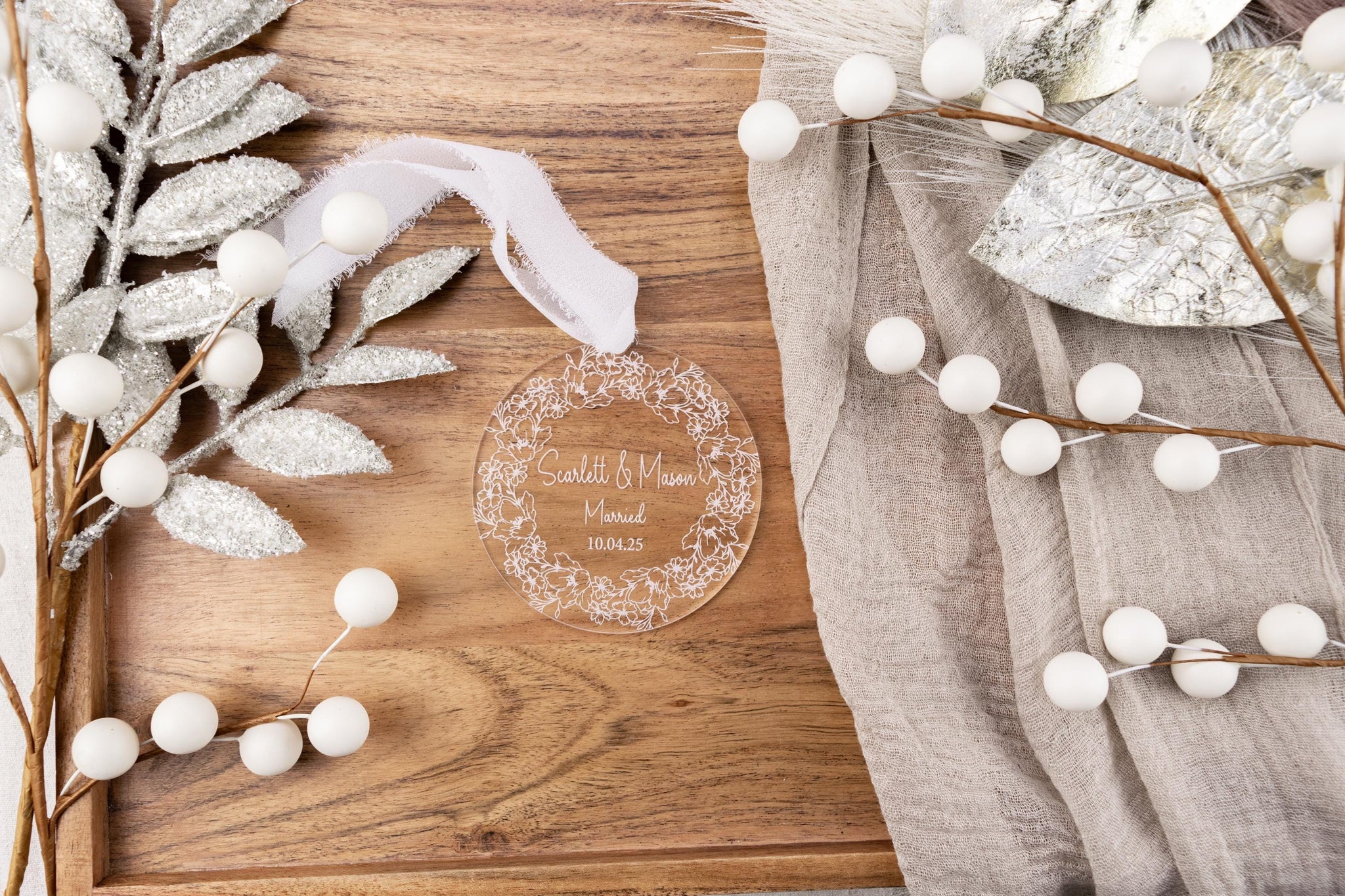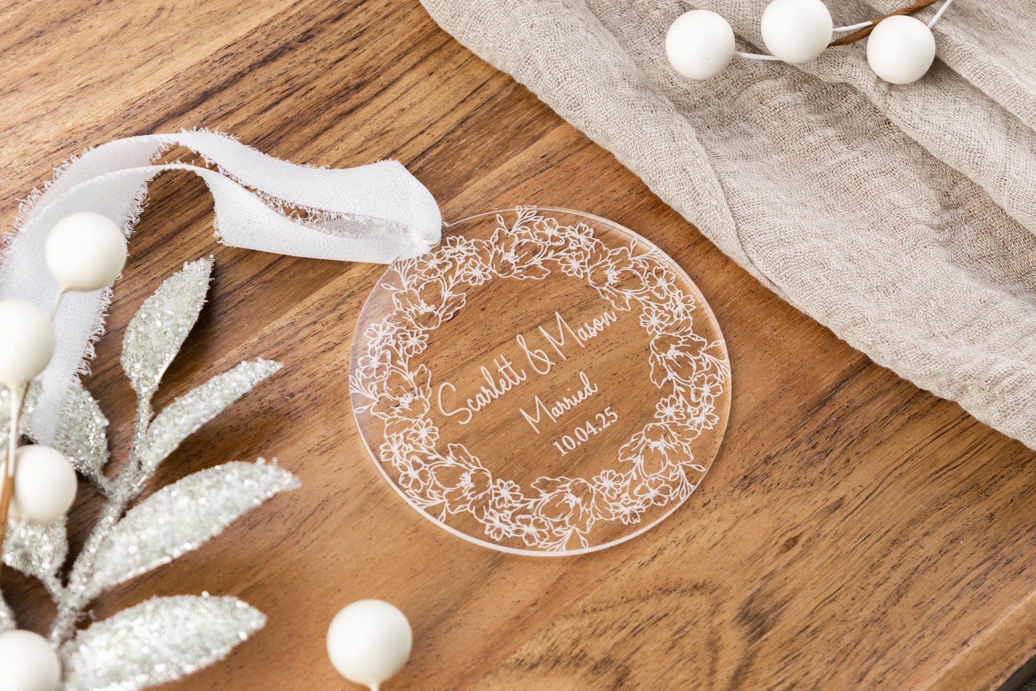 Each ornament is laser engraved on clear acrylic and features a detailed floral wreath encircling your personalized details. The design includes both names, the word “Married,” and your special date. Creating a meaningful way to commemorate the day you said “I do.”