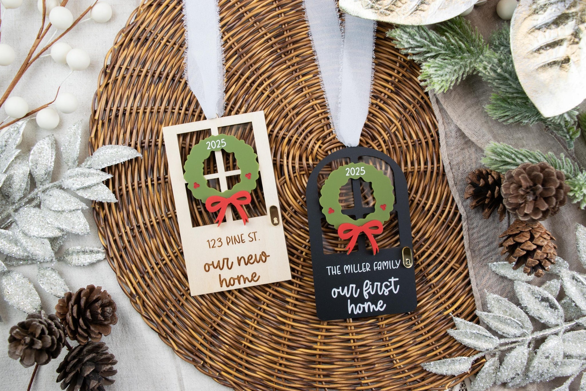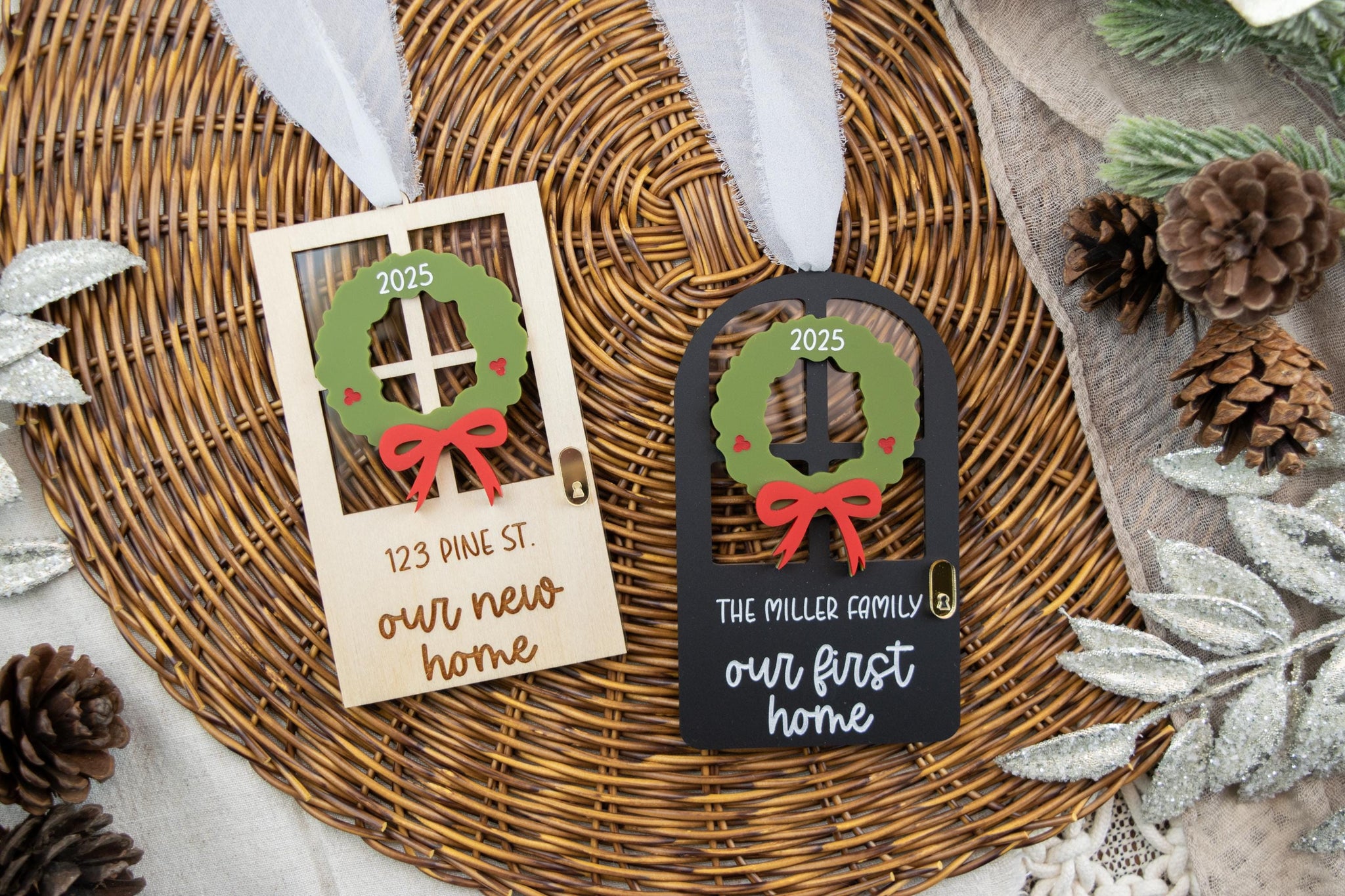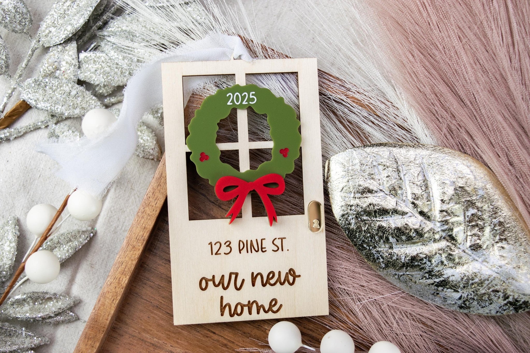 Each ornament features a layered front door design with a clear acrylic window, engraved year on the wreath, and your choice of wording: Our First Home, My First Home, Our New Home, or My New Home. The top line can be customized with your family name or address for a personal touch.