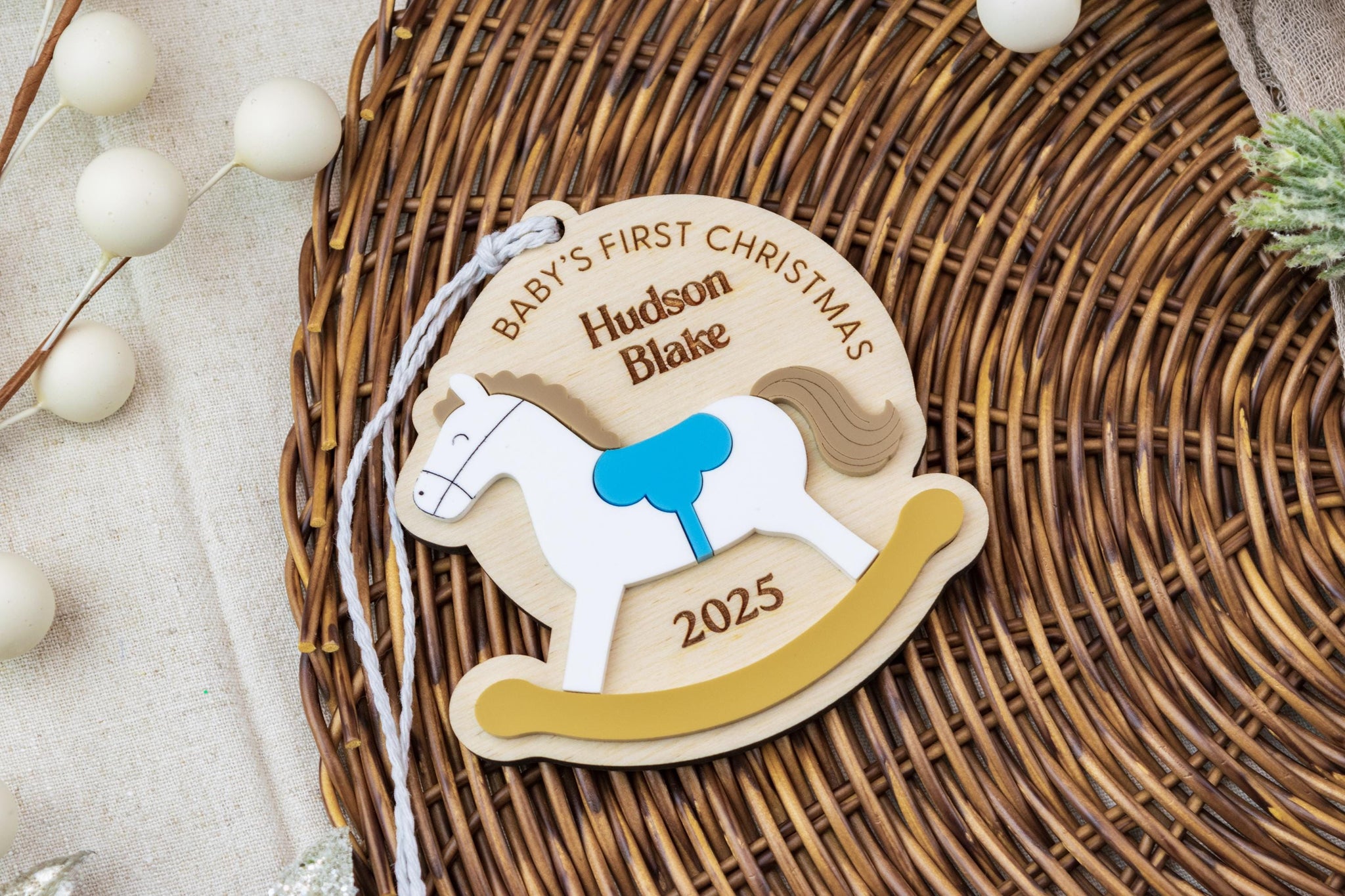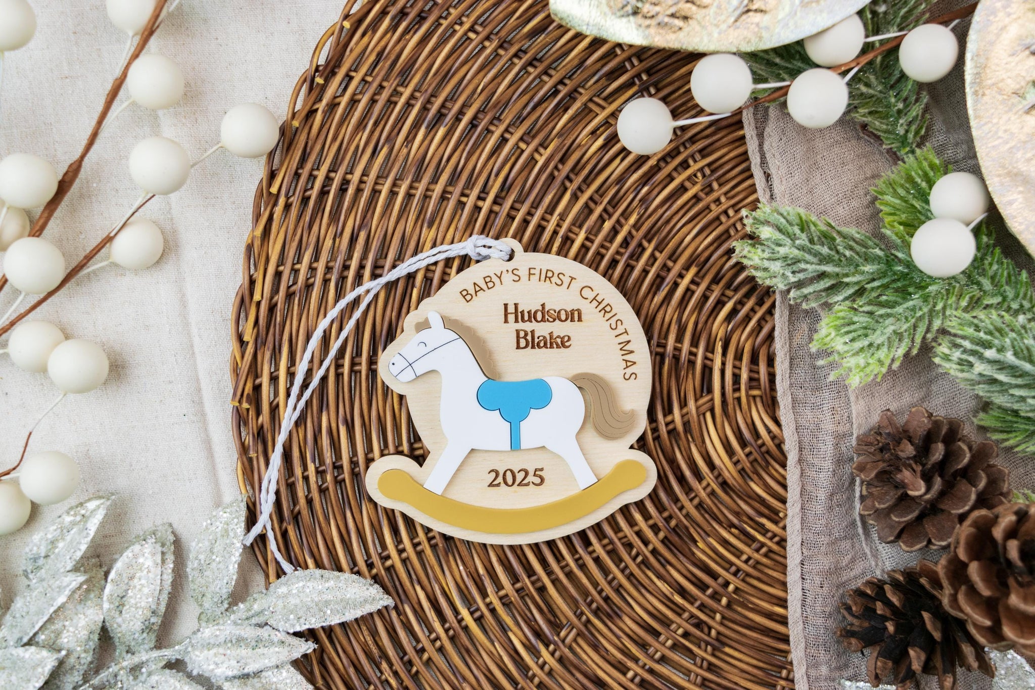 Each ornament is personalized with your baby’s name and the year, creating a beautiful keepsake that will be cherished for years to come. The timeless rocking horse design adds a nostalgic touch to your holiday décor. Perfect for commemorating your little one’s first Christmas.