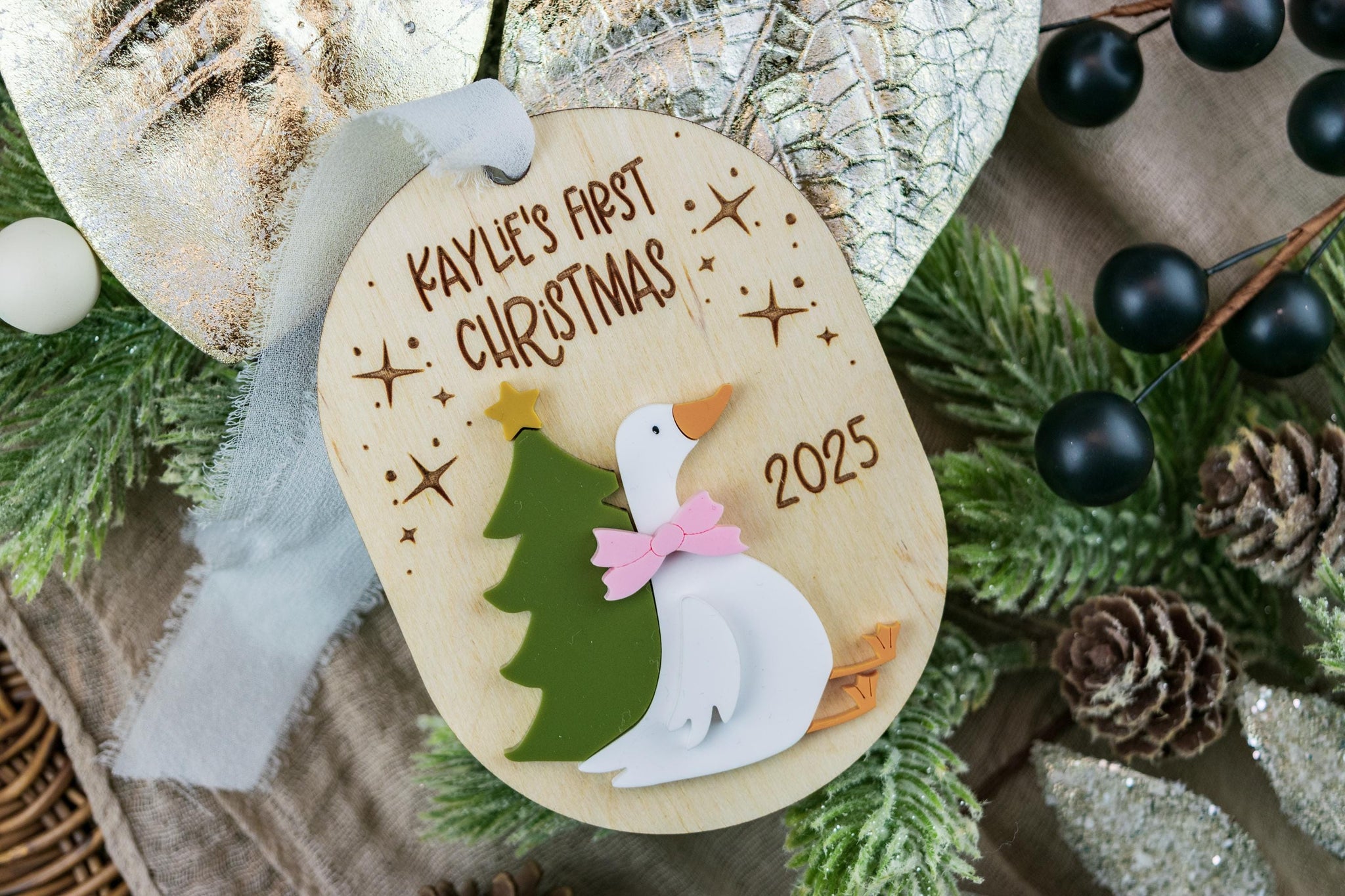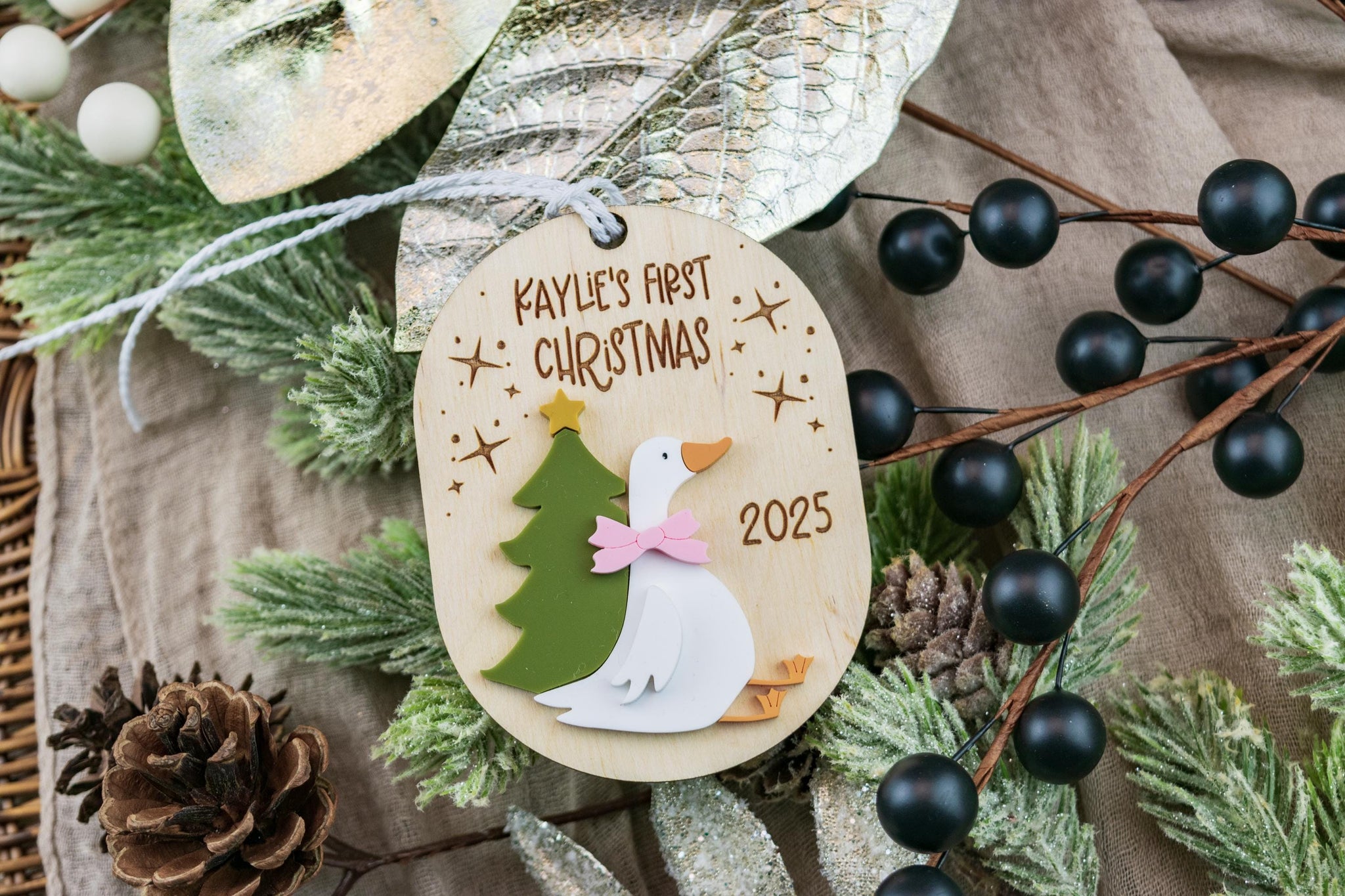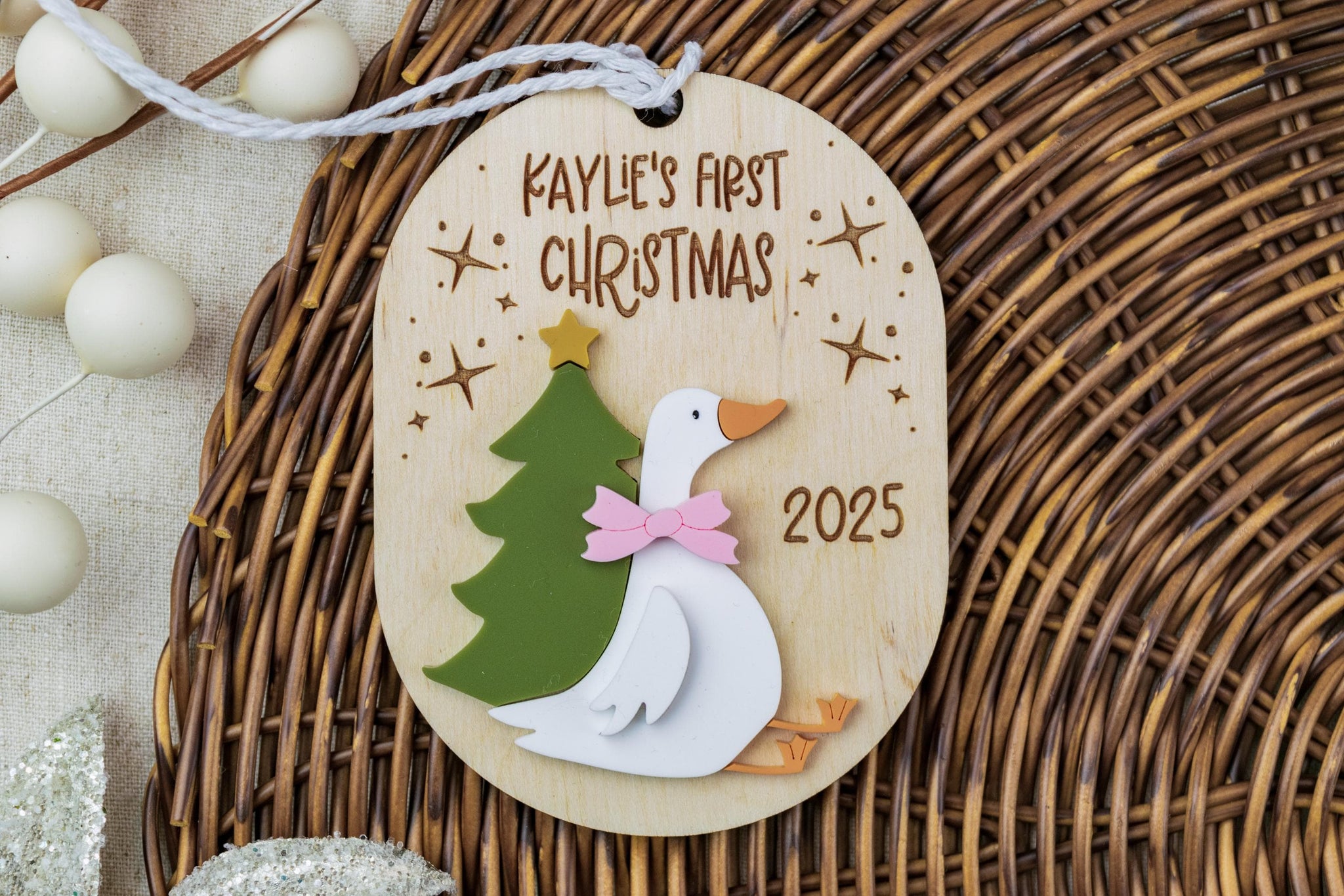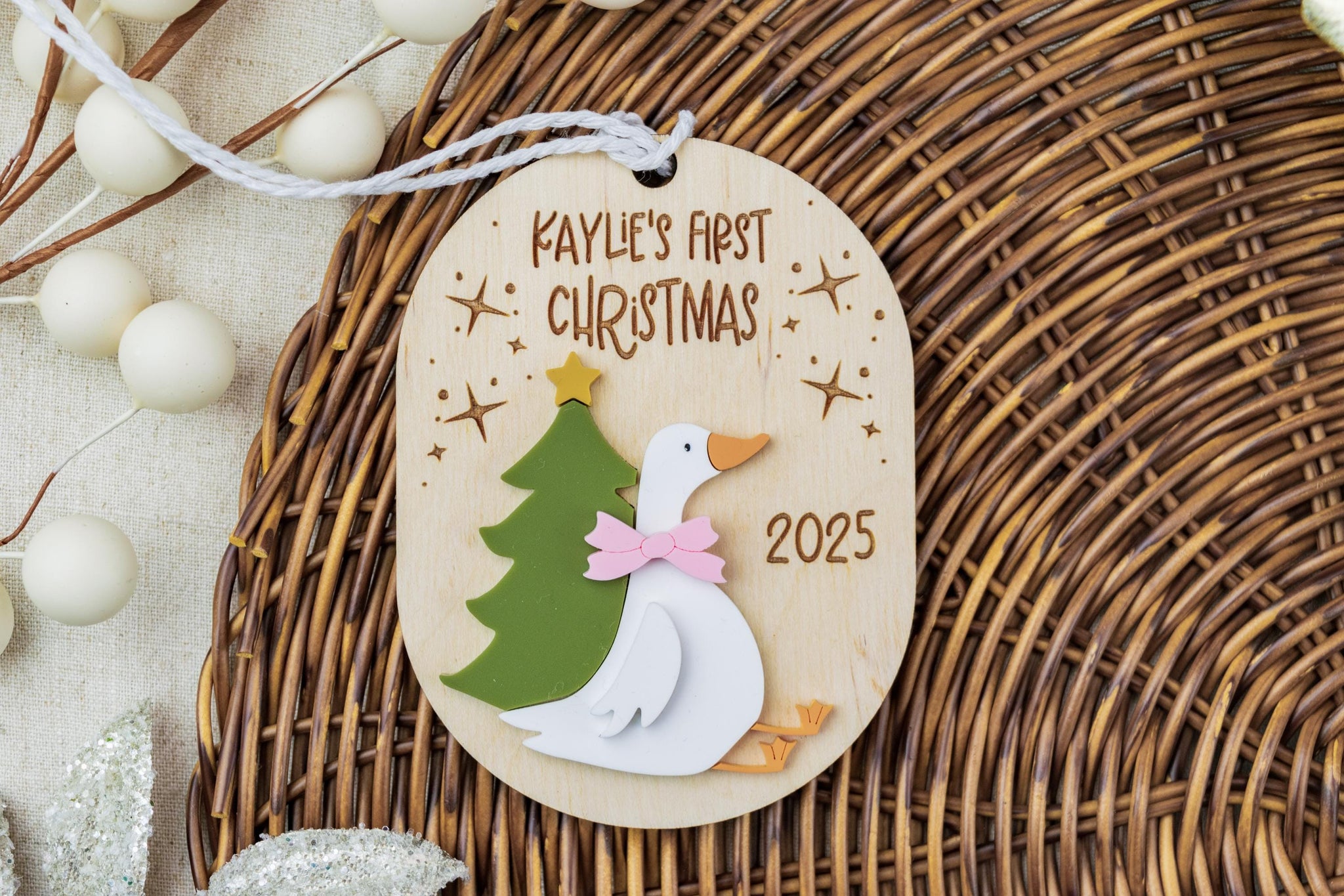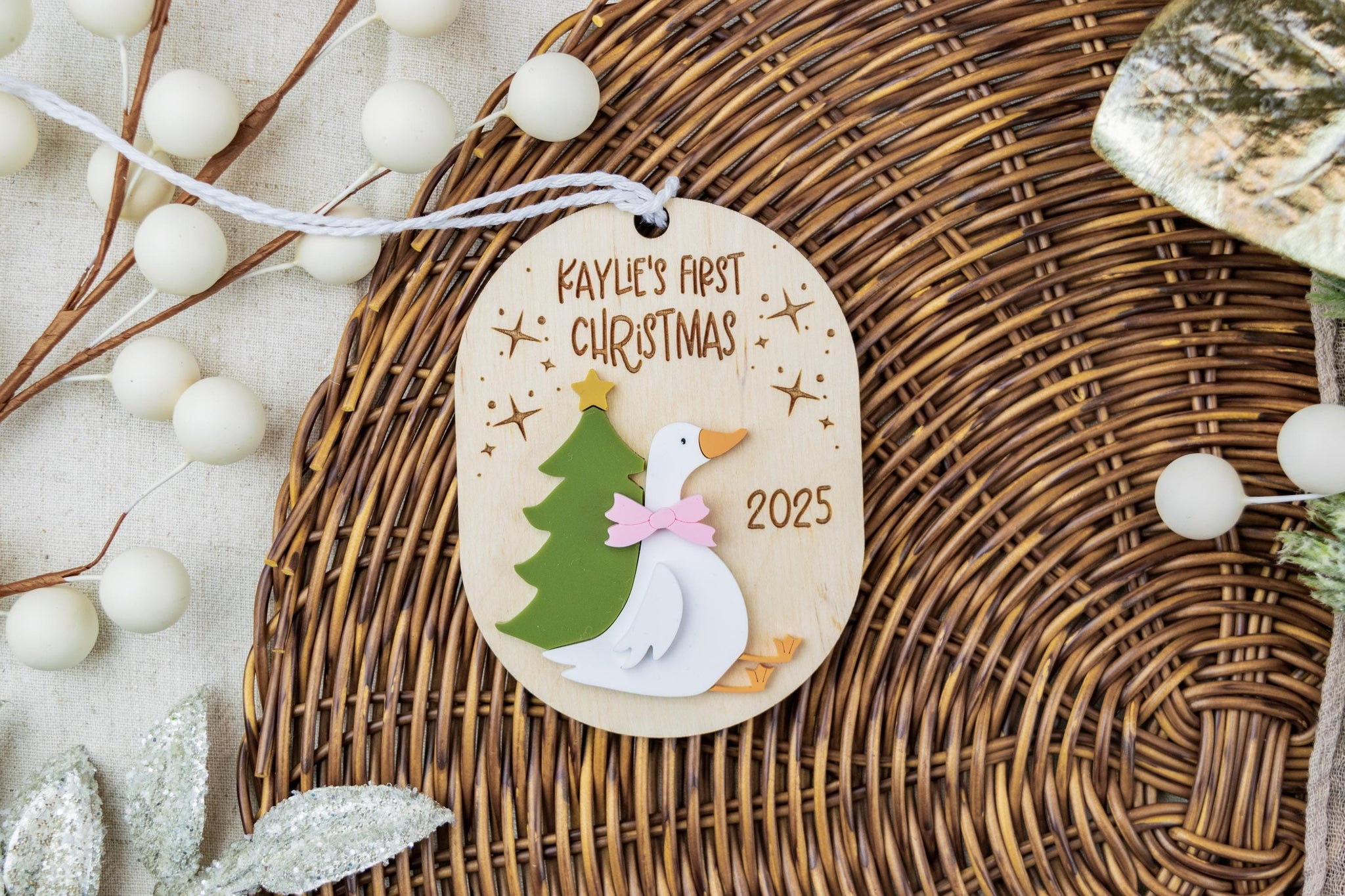 Add a bit of charm and whimsy to your holiday tree with this sweet “Silly Goose” Baby’s First Christmas ornament. Each piece is handcrafted from ¼” birch wood and features a layered acrylic goose and tree design, giving it a playful yet timeless look that’s perfect for celebrating your little one’s first Christmas.